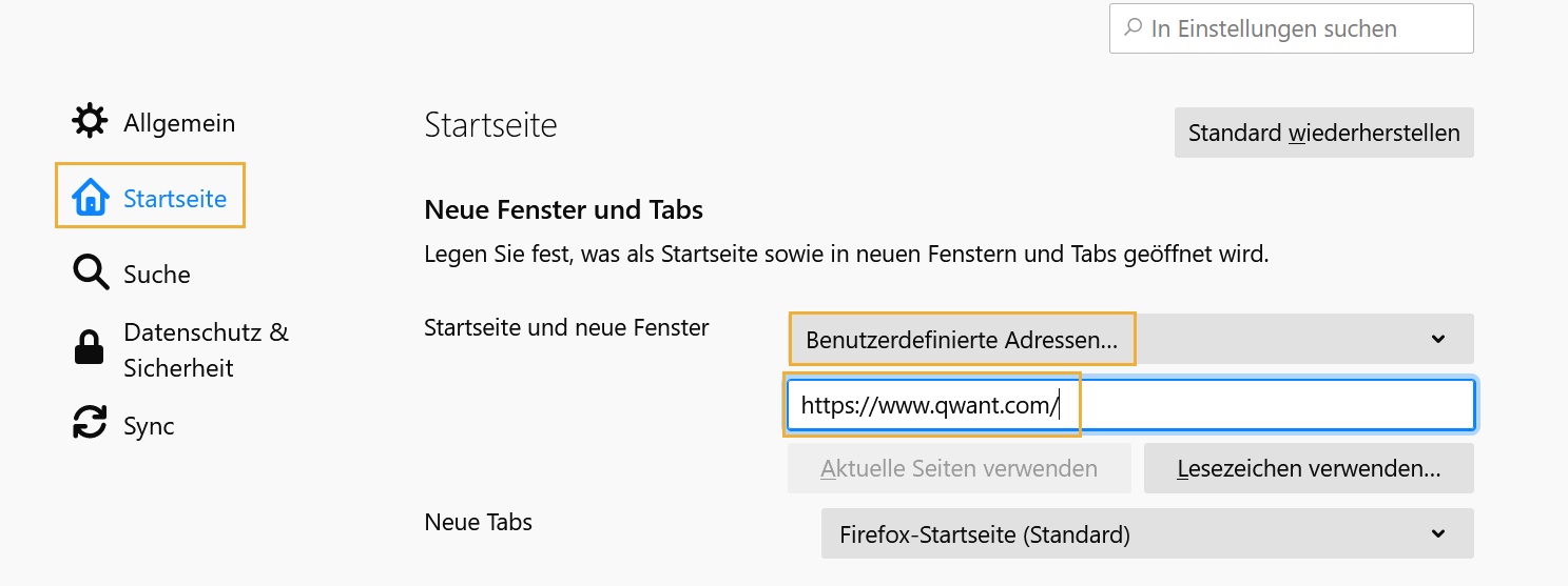 Bestimmen Sie Qwant als Startseite in Firefox