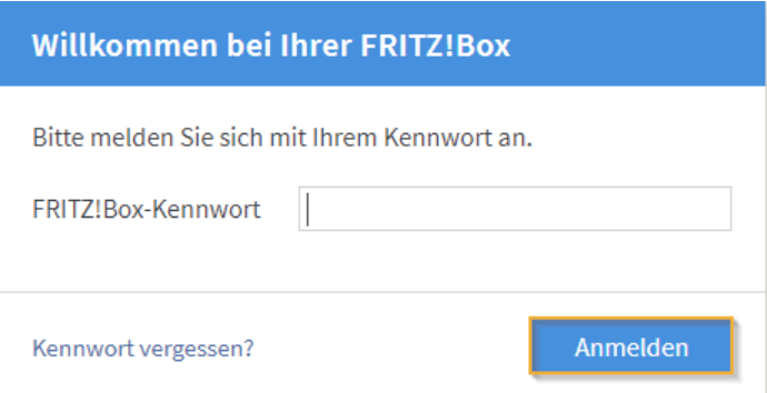Geben Sie auf der folgenden Anmeldeseite ihr FRITZ!Box Kennwort in das Feld „FRITZ!Box-Kennwort" ein und klicken Sie auf „Anmelden".