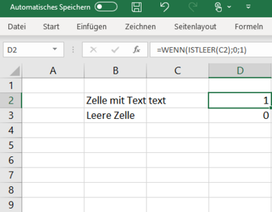 - Beispiel im Bild: Die Prüfung ist =WENN(ISTLEER(C3). C3 ist dabei die zu prüfende Zeile. 0 entspricht dem "Dann" und die 1 entspricht dem "Sonst". Wenn die Zelle C3 leer ist, dann gibt die Funktion 0 aus, ansonsten 1.