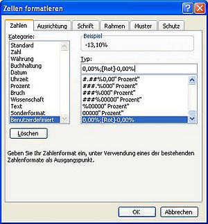 In dieses Feld können Sie beliebige Zahlenformate eingeben. Das Zahlenformat, in dem positive Prozentzahlen in Standardfarbe und negative Prozentzahlen in Rot ausgegeben werden, sieht folgendermaßen aus: