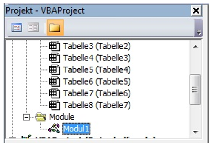 Rufen Sie mit der Tastenkombination ALT F11 den Visual Basic Editor auf. Darin finden Sie den Projekt Explorer, den Sie auf der Abbildung sehen.